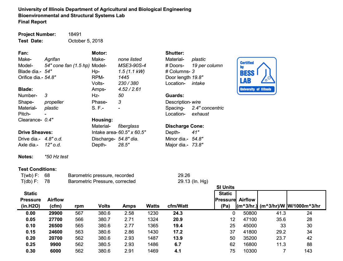 靜壓0.1英寸水柱下的風量是極其重要的,因為它是畜禽舍環(huán)境下風機的運行環(huán)境壓力。風機的性能數(shù)據(jù)通常是靜壓0水柱,但在實際運用過程中很少用到。作為通風設計標準,養(yǎng)豬手冊和養(yǎng)牛手冊提供了在寒冷、溫和和炎熱氣侯下的通風比率。選持合適的風機才能滿足這些需求。